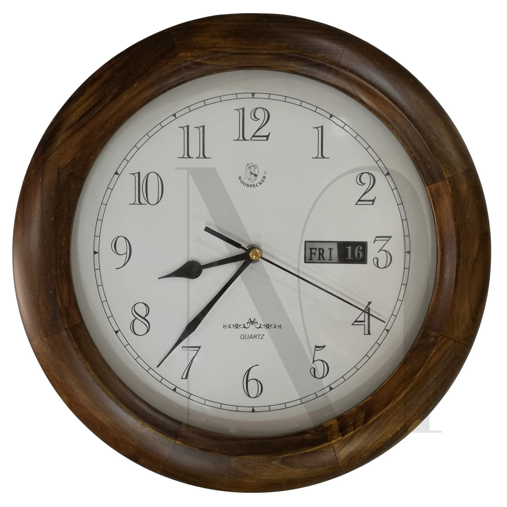 woodpecker quartz analog round wall clock with calendar 28cm diameter