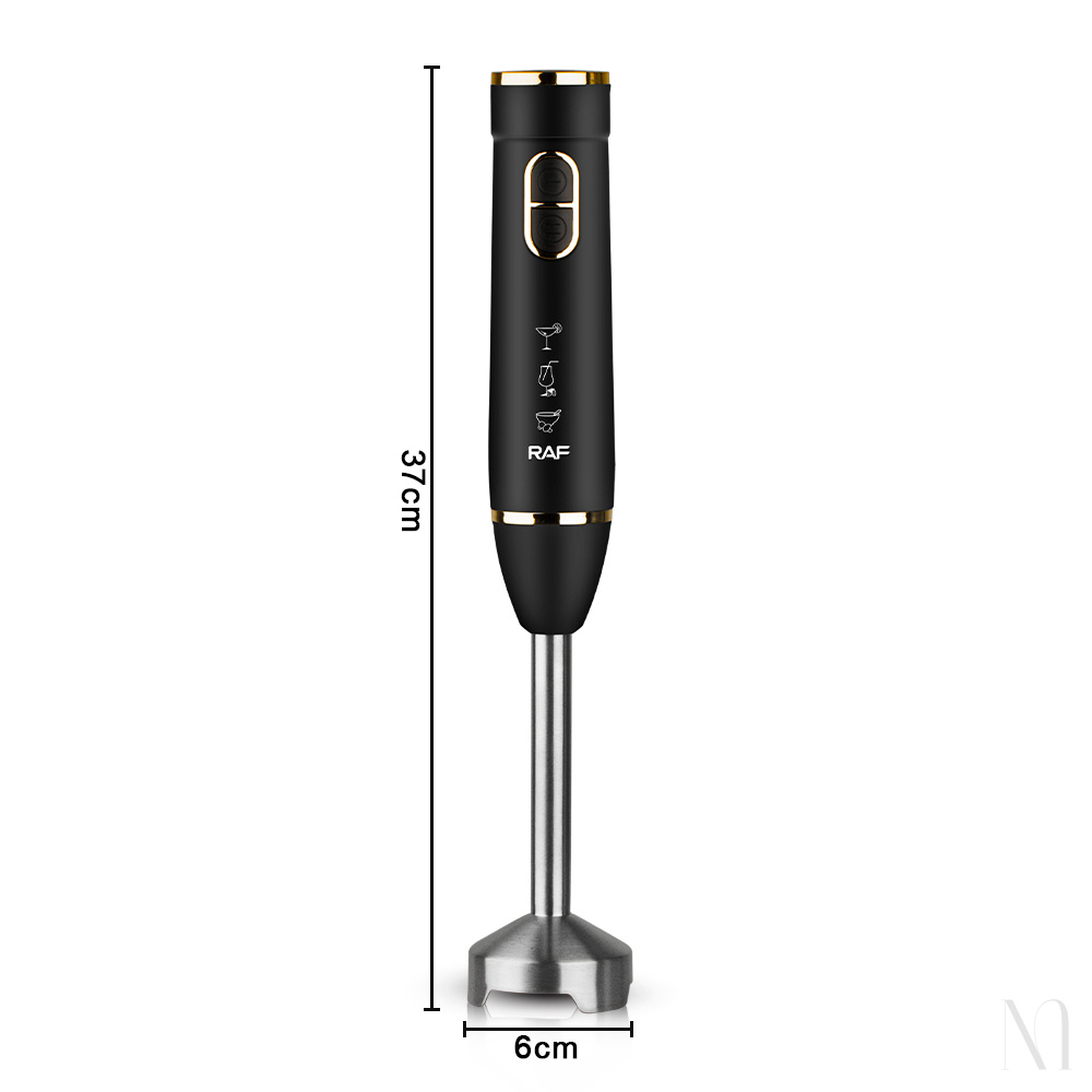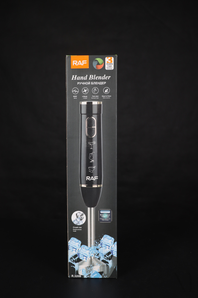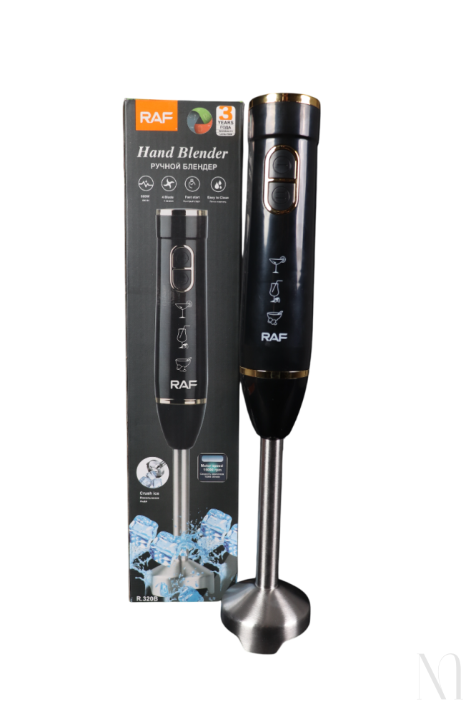 Description Brand = RAF Hand Blender Watt = 800 4 Blades Fast Start 600ML Blender Jar Model = R.313B Colour = Black 1. Juice 2. Cakes 3. Vegetable Puree 4. Mashed Potatoes 5. Smoothie ...