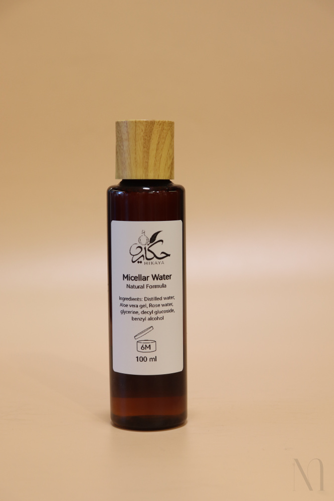 Hikaya Micellar Water, Natural Formula ingredients: Distilled Water, Aloe Vera gel, Rose Water, glycerine, Decyl Glucoside, Benzyl alcohol.